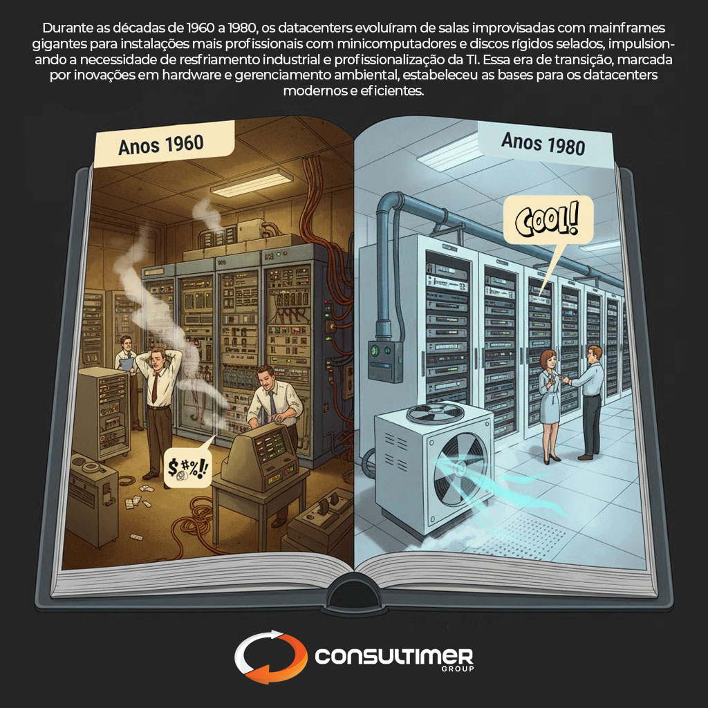 Os anos 1960-1980 nos ensinaram que evolução tecnológica é menos sobre velocidade e mais sobre adaptação. Dos mainframes caros aos minicomputadores acessíveis, dos cartões perfurados aos discos selados, e do calor infernal ao resfriamento controlado – tudo isso moldou os datacenters resilientes que usamos hoje.